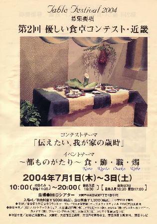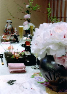 テーブルを囲んで家族水入らずの楽しい晩餐。 夕映えの海を見ながら恋人どうしの素敵な食事。 別れを前に、あるいは再会を祝っての食事のひとときは、私たちの人生に忘れがたい思い出を残してくれます。あのときに誰と何を食べ、何を飲んだか・・・・・・デザートやコーヒーの香りに至るまで、私たちの舌は実に細々と記憶しているものです。そんなとき、目の方はどうでしょう。味もさることながら、視覚も十分に楽しむことができれば、たった一度の食事の記憶がさらに鮮明なものとなって残ります。つまり、テーブルコーディネートという演出が欠かせないわけです。盛り付けや器の配色配膳にと、食卓をアートにまで高めるべく趣向をこらすそのアーティストをテーブルコーディネーターと呼んでいます。コーディネート(coordinate)という英語の呼び名から、何かバタくさい新しい職業と思いがちですが、これは古来私たちの食卓をさり気なく飾ってくれた和風にもあてはまります。会席料理に見る粋を極めた配膳の妙は、見る人の目を奪います。食事を提供する仕事をしてきた私は、配膳に関してあれこれ心を配ってきたのは言うまでもないことですが、昨年「第一回優しい食卓コンテスト」がMIDシアターで開催された折、ふと思いついて出品し、それがまぐれ入選したことから、テーブルコーディネートの世界に今まで以上に興味を持ってしまいました。 で、今年の二回目のコンテスト(7/1〜7/3)に出す作品作りをしていたときのことです。 今回私は「嫁ぐ娘と最後の晩餐」をテーマにコーディネートしてみることにしました。娘のいない私の密かな夢だった"嫁ぐ娘への想い"をこめて・・・・・・。 打掛の袖をテーブルクロスに使い、そこには「花嫁人形」がどうしても欲しいのです。 探し回っても見つける事ができず、思い余って友人の池田さんにお願いしました。 「どうしても千代紙で折った花嫁人形を使いたいんですが、探して頂けないでしょうか」 池田さんは一人一人にあたって下さり、その一人がまた別の人に・・・・・・というように情報はいろんな場所にめぐり行き、とうとう千代紙作家の先生の所までたどり着くことができたのです。その先生は、池田さんにとっても未知の方でした。 出品のしめ切り日もあと一日に迫り、「花嫁人形」のことばかり考えながら一夜を明かした朝のことです。疲れきって眠りについたとき、「中村さんという先生が、人形をもって今お店に来られてます」との電話にとび起きました。きくと、「郵便局に朝10時までに出して頂ければ夕方に私の手元に着く」という間違った情報を信じた先生は、その朝9時に郵便局に。しかしその日には着かないと言われ、その足で高石市から池田まで(二時間近くかかる)わざわざ届けてくださったのです。顔も知らない全く未知の私のために、千代紙の小さな小さな花嫁人形を持って! 「花嫁人形」のうれしさもさることながら、先生の無償の好意に興奮と感動で心が高ぶり、その日はとうとう一睡もできませんでした。 長い人生には、こんなうれしい日もあるんですね。 夢の蕾(つぼみ)が人の好意の光に触れて美しい花を咲かせた。そんなおとぎ話の一篇でした。 |