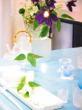 | 前回お伝えした第二回目の"やさしい食卓コンテスト"は、中村先生からの思いがけないプレゼント―可愛い千代紙の花嫁人形で飾った、私にとっては最高のテーブルコーディネートになったのですが残念ながら落選してしまいました。 コンテストである限りは、仕方ありませんね。 けれどもそれを通して出逢えたひとつのめぐり合わせは、私には入選以上の嬉しさだったことに違いはありません。 実はもうひとつ、別のテーマでテーブルコーディネートしてたのですが、いい機会ですからこれも見て頂ければ・・・と思い、今回はこのコーナーで一緒に水色のテーブルを楽しんでみてください。 |